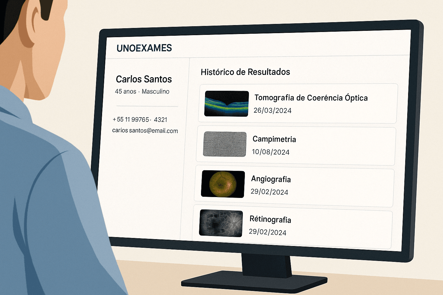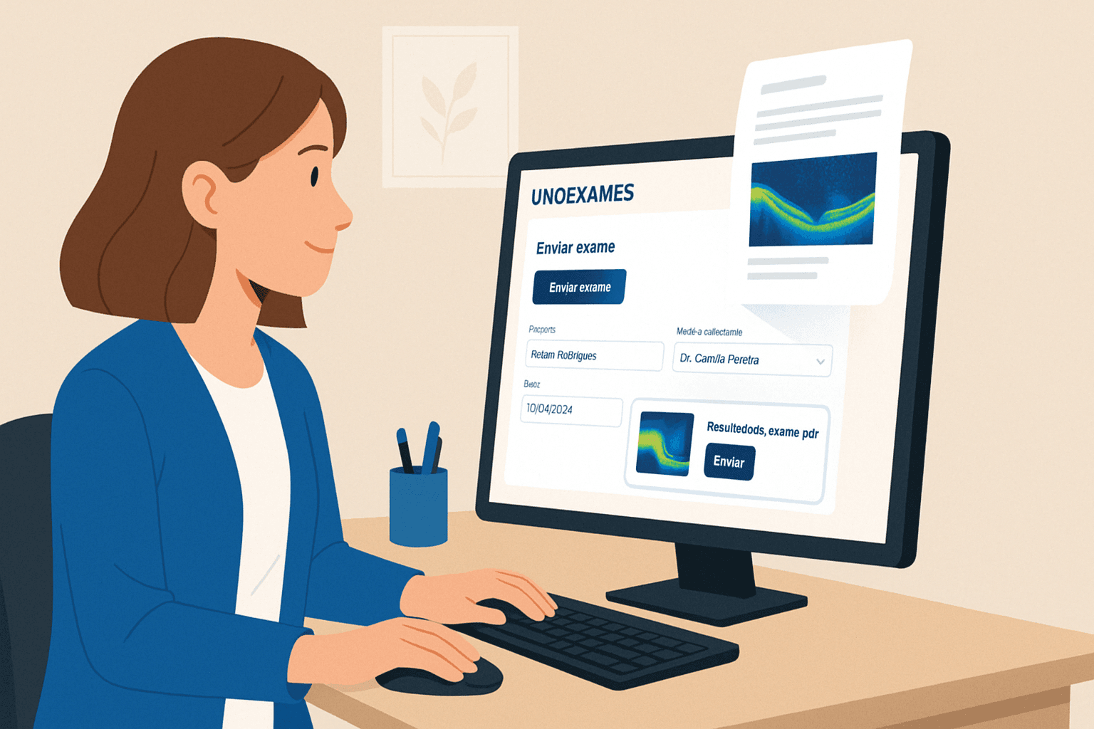 O Unoexames vincula os arquivos ao exame do paciente, exibe miniaturas, organiza por data e facilita a busca quando for necessário. Próxima etapa: revisão pela equipe médica.