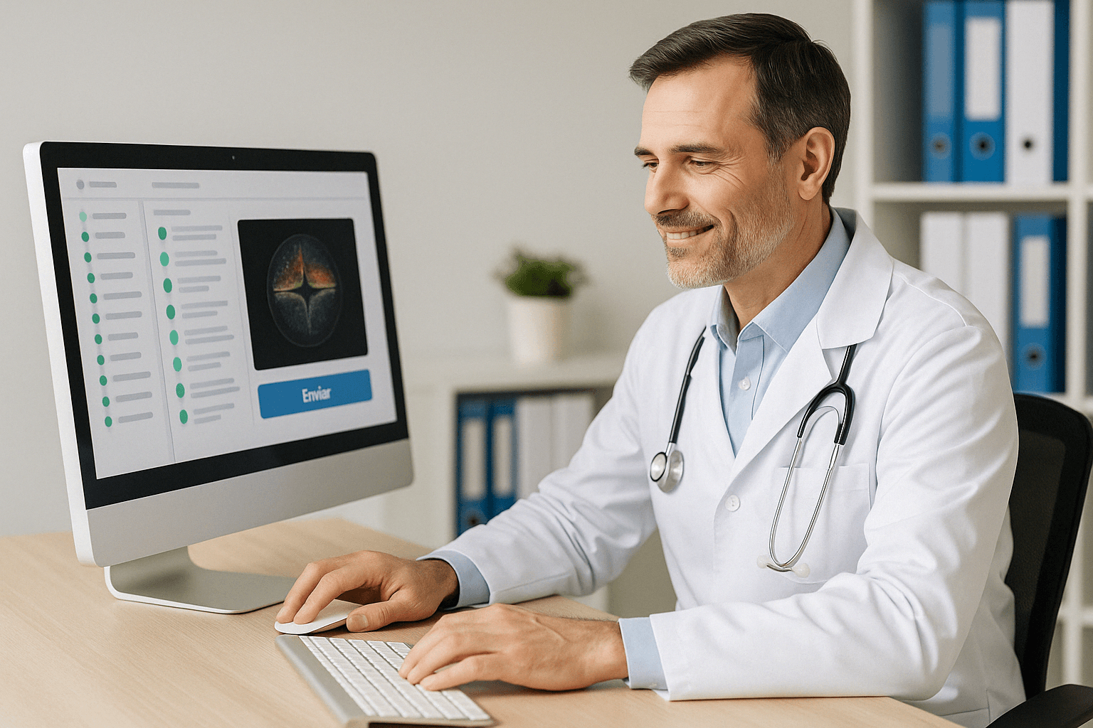 O médico revisa os exames e os pré-laudos feitos por IA com agilidade e decide o que está pronto para ser enviado. Sem sobrecarga, sem perder tempo e com total segurança.